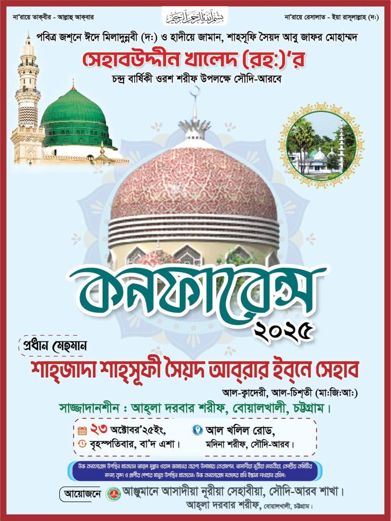 পবিত্র ঈদে মিলাদুন্নবী (দ:) মাহফিল ও হযরত সেহাবউদ্দীন খালেদ (রহ:) কনফারেন্স আজ আহলা দরবার শরীফের ত্বরিকত ভিত্তিক আধ্যাত্মিক সূফি সংগঠন আঞ্জুমানে আসাদীয়া নূরীয়া সেহাবীয়া সৌদি আরব শাখার ব্যবস্থাপনায় কিংডম অব সৌদি আরব কেএসএ এর পবিত্র নগরী মদিনা শরীফে জশনে জুলুস পবিত্র ঈদে মিলাদুন নবী (দঃ) মাহফিল এবং হাদীয়ে জামান হযরতুল