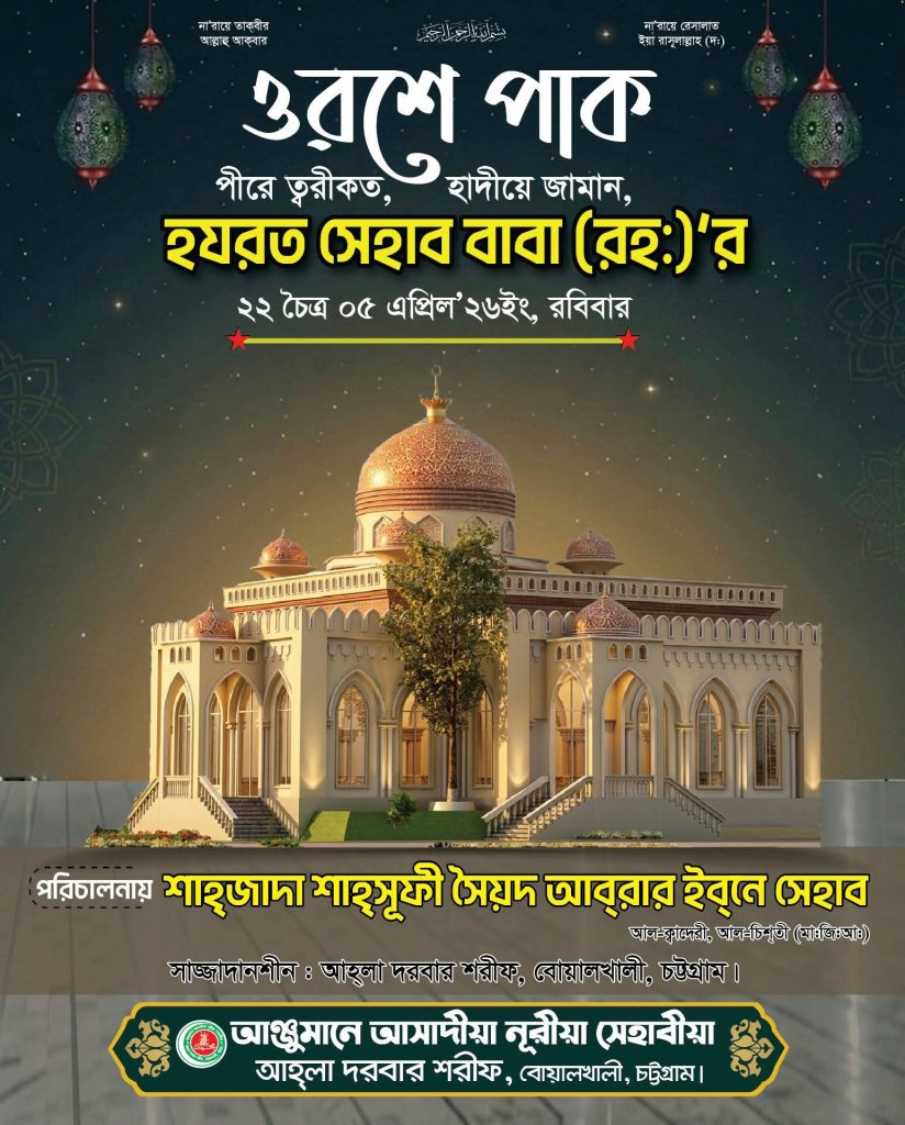 চট্টগ্রামের আহলা দরবার শরীফে ভক্ত-আশেকের মিলনমেলা: আগামীকাল রবিবার হাদীয়ে জামান হযরত সৈয়দ সেহাবউদ্দীন খালেদ (রহঃ) এঁর ১৫তম ওরশ শরীফ আলমগীর রানা, চট্টগ্রাম (বোয়ালখালী) থেকে : হাদীয়ে জামান হযরত সৈয়দ আবু জাফর মোহাম্মদ সেহাবউদ্দীন খালেদ (রহঃ) এঁর ১৫তম পবিত্র বার্ষিক ওরশ শরীফ ভক্ত-আশেকের মিলনমেলায় রূপ নিয়ে আগামীকাল (৫ এপ্রিল) রবিবার যথাযোগ্য