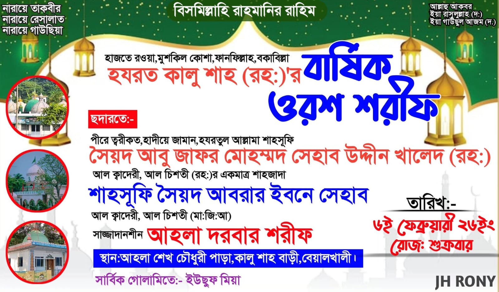 হযরত কালু শাহ্ (রহ:) পবিত্র বার্ষিক ওরশ মোবারক উপলক্ষে উপমহাদেশের তরিকত চর্চার অন্যতম প্রাণকেন্দ্র, পবিত্র ভূমি চট্টগ্রামের ঐতিহ্যবাহী আহলা দরবার শরীফের তরিকত ভিত্তিক আধ্যাত্মিক সূফী সংগঠন আঞ্জুমানে আসাদীয়া নূরীয়া সেহাবীয়া আহলা শেখ চৌধুরী পাড়া কালু শাহ বাড়ি শাখার উদ্যোগে ও ব্যবস্থাপনায় ইউছুফ মিয়ার সার্বিক সহযোগিতায় পবিত্র জশনে জুলুসে ঈদ-এ মিলাদুন্নবী (দ:) ও সেমা মাহফিল চট্টগ্রামের বোয়ালখালীর আহলা শেখ চৌধুরী পাড়া কালু শাহ বাড়িতে ২৪শে মাঘ ৬ ফেব্রুয়ারি শুক্রবার অনুষ্ঠিত হয়।